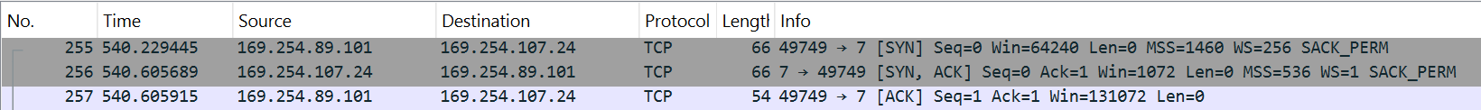 With the tool Wireshark the TCP handshake can be observed. It should look like in the image below.